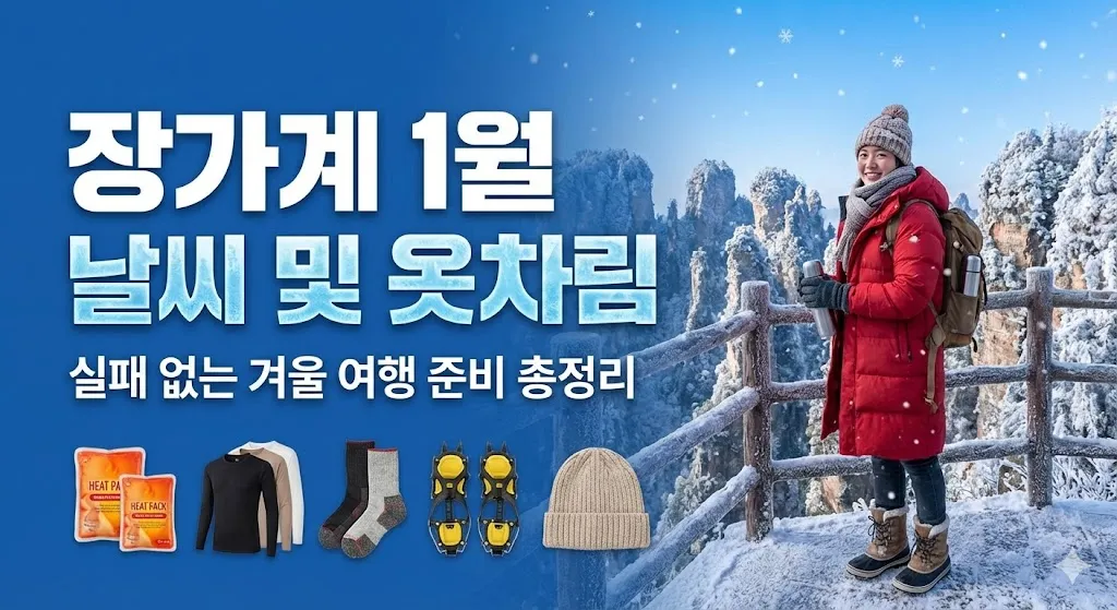 “1월에 장가계 가도 괜찮을까요?” 겨울 장가계는 수묵화 같은 신비로운 설경을 자랑하지만, 습도가 높아 체감 온도가 매우 낮습니다. 실패 없는 여행을 위한 날씨 정보와 필수 옷차림 준비법을 꼼꼼하게 정리해 드립니다! 🏔️