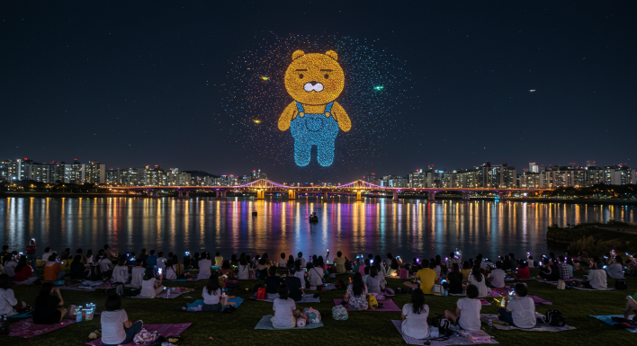 매번 색다른 테마로 우리를 놀라게 하는 뚝섬 드론쇼! 올해는 정말 역대급 콜라보레이션이 준비되어 있다고 해요. 특히 첫 공연은 넷플릭스 애니메이션 영화인 〈케이팝 데몬 헌터스〉 스페셜로 꾸며진다고 하니, 팬이라면 절대 놓칠 수 없겠죠? 그 이후 회차들도 우리에게 너무나 친숙한 카카오 인기 캐릭터(라이언, 어피치 등)들이 밤하늘을 수놓을 예정이라고 하니, 아이들과 함께 가도 정말 좋을 것 같아요!